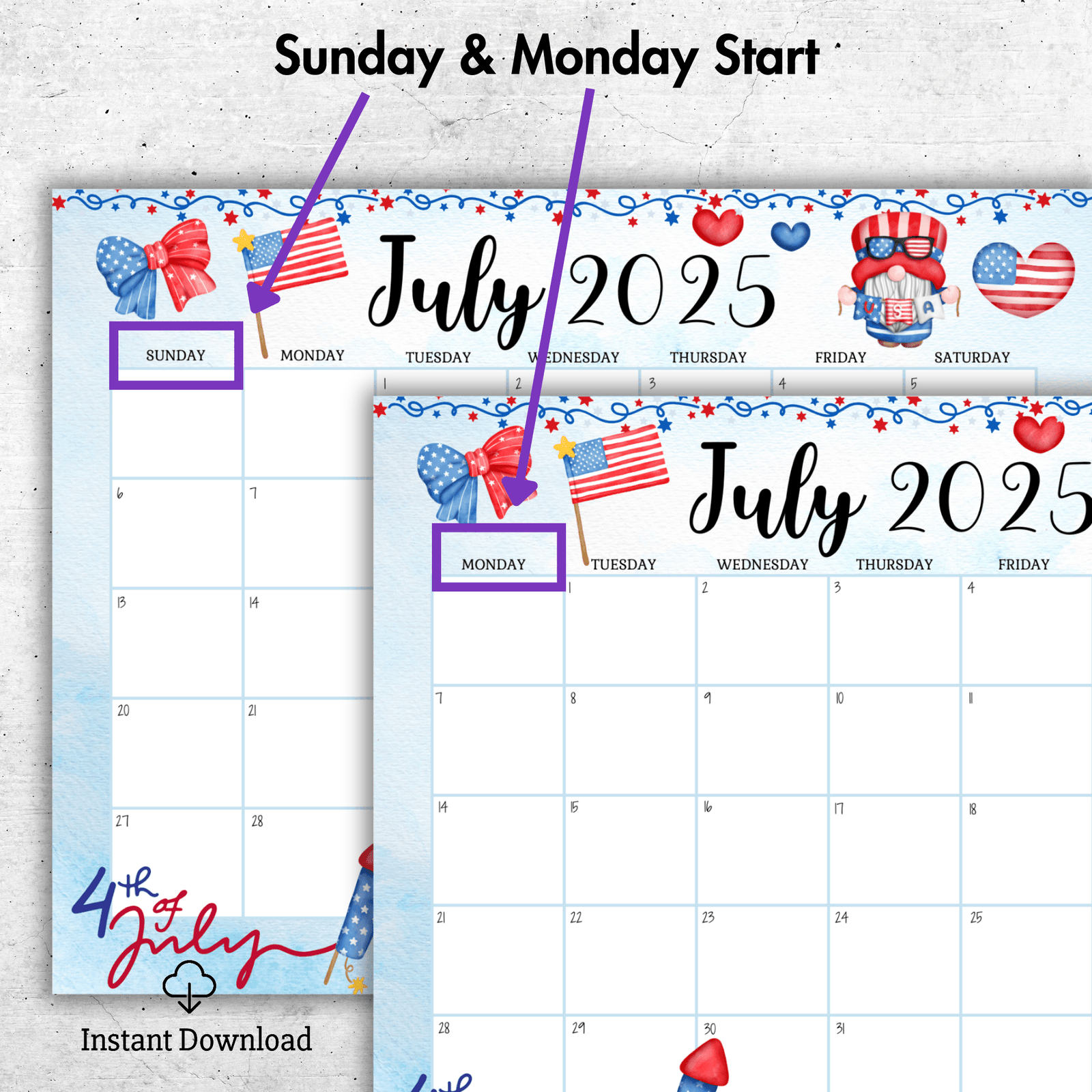 Festive and fun 4th of July 2025 Gnome Calendar Printable ? fillable PDF, Sunday & Monday start, instant download.