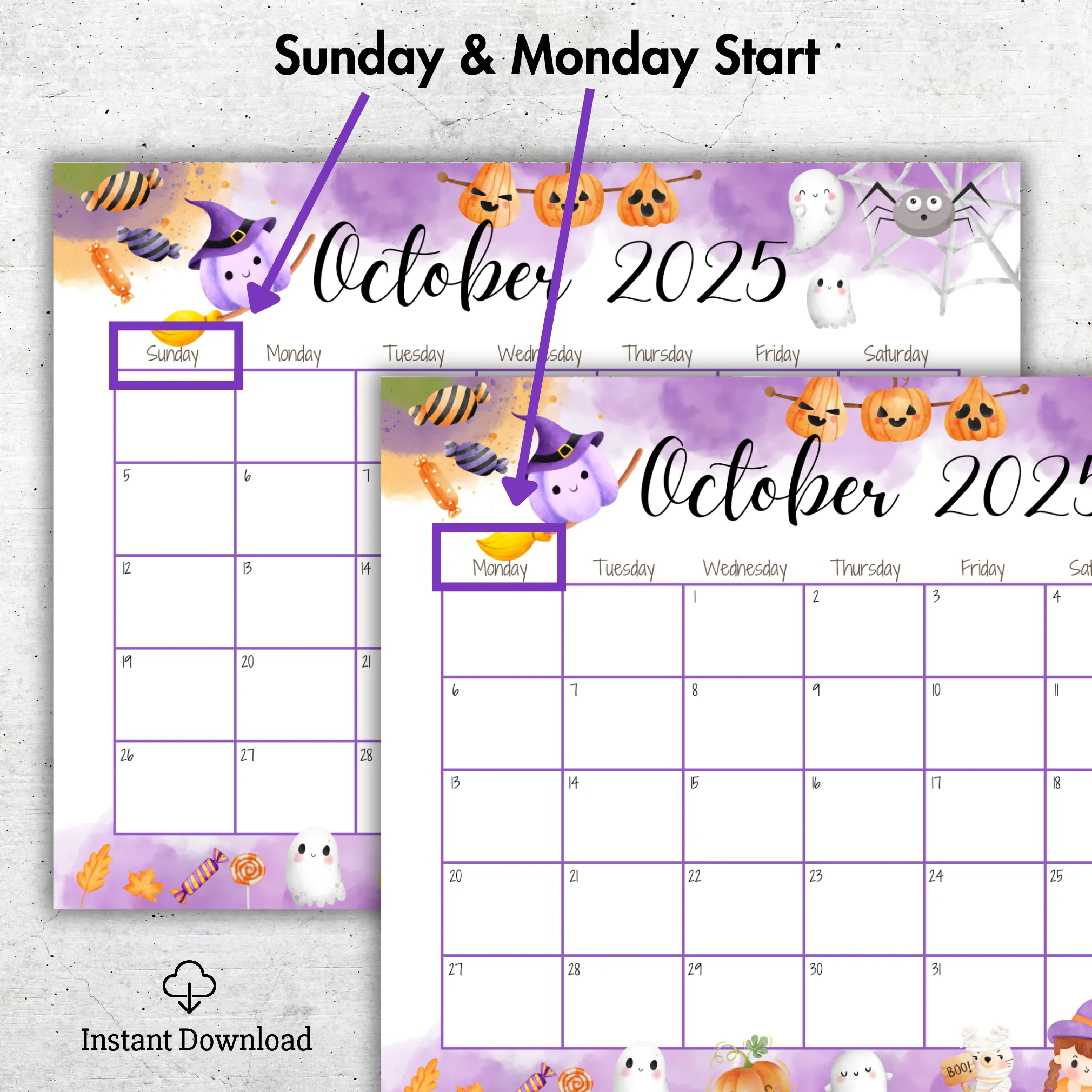 Plan your October in style with our October 2025 Calendar Halloween Theme ? a fun, spooky, and highly functional monthly planner perfect for keeping track of all your important dates and activities. Designed with adorable Halloween elements such as pumpkins, ghosts, spider webs, and candy, this calendar adds a seasonal charm to your home, office, or digital workspace. Whether you prefer Sunday or Monday start, you?ll have both versions available to fit your planning style.