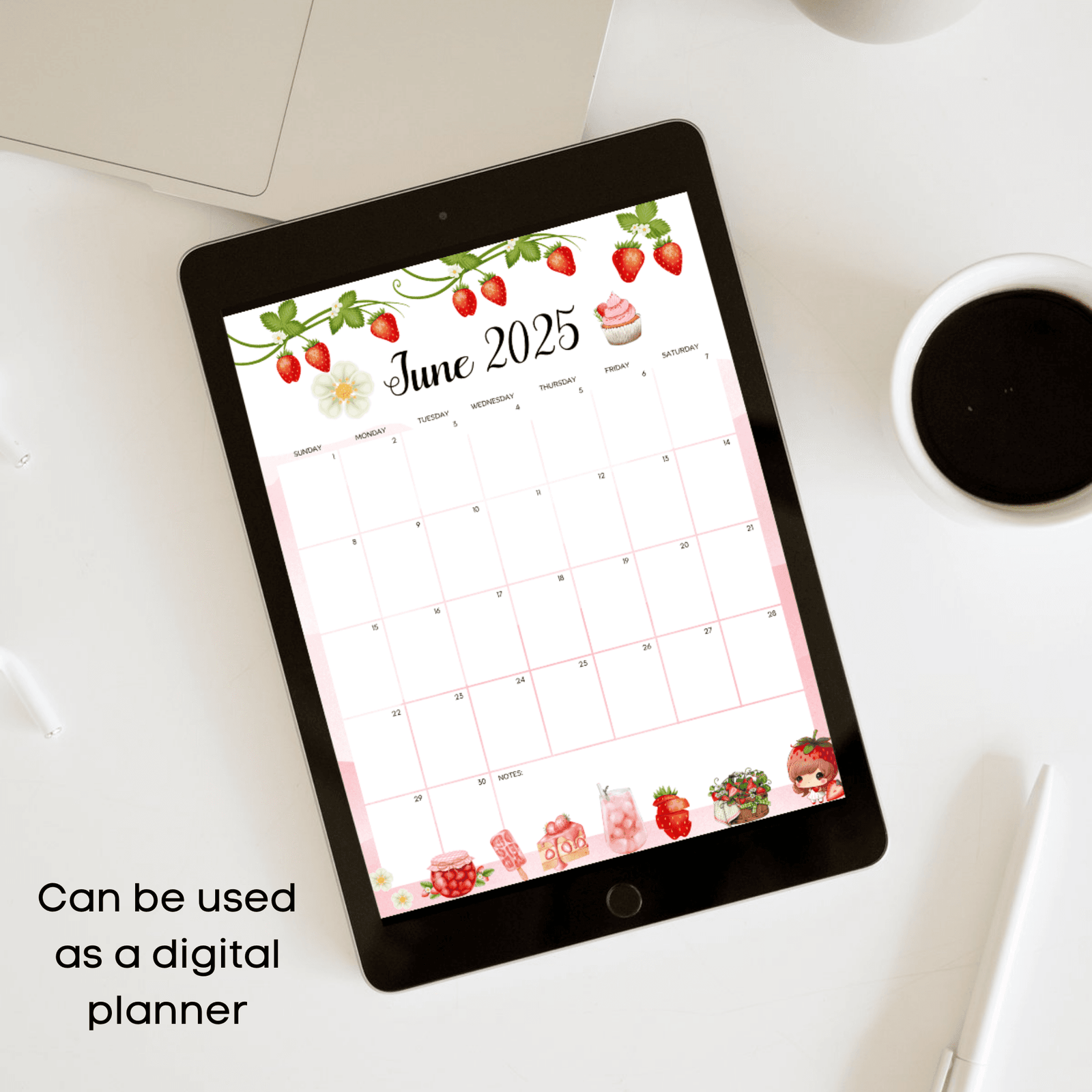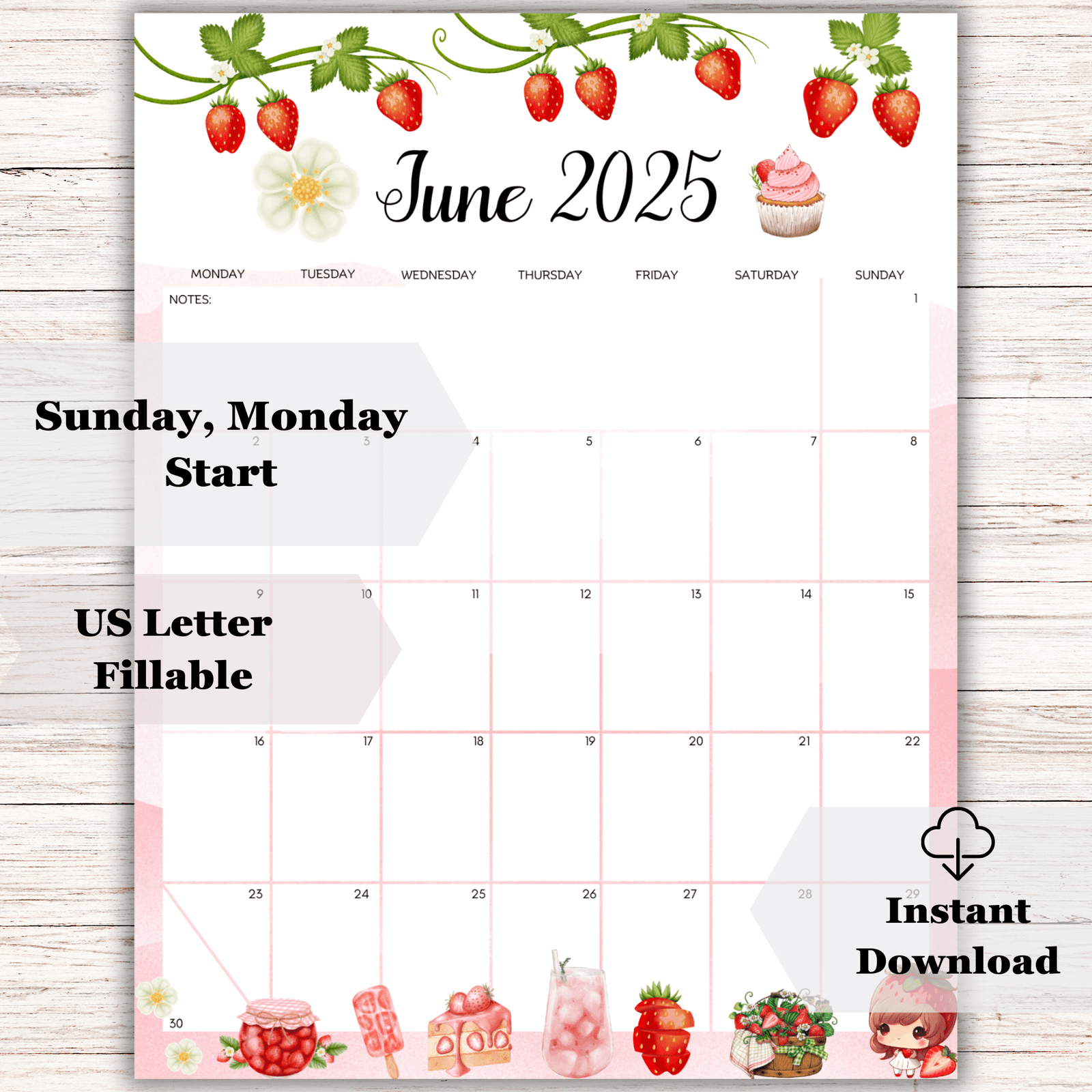 Printable June 2025 Strawberry Calendar and sweet dessert theme. Fillable PDF in Sunday & Monday start. US Letter size. Kawaii and fun design!