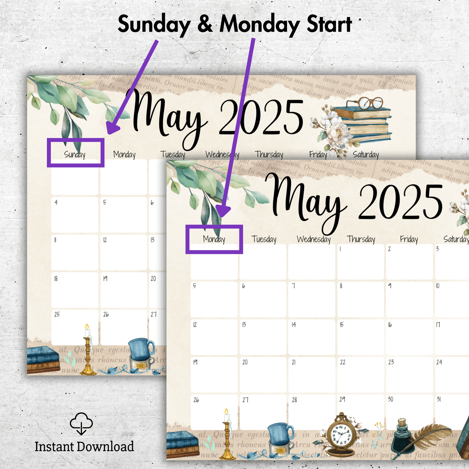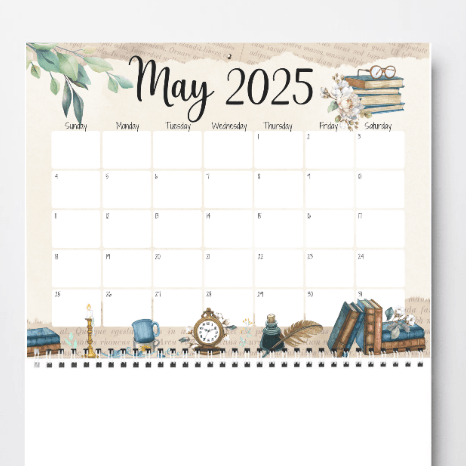 Add a timeless literary touch to your planning with this Printable May 2025 Calendar with Vintage Books. ?Designed with beautiful watercolor illustrations of classic books, candles, ink bottles, antique pocket watches, and botanical accents, this calendar is perfect for readers, writers, and old-soul creatives.