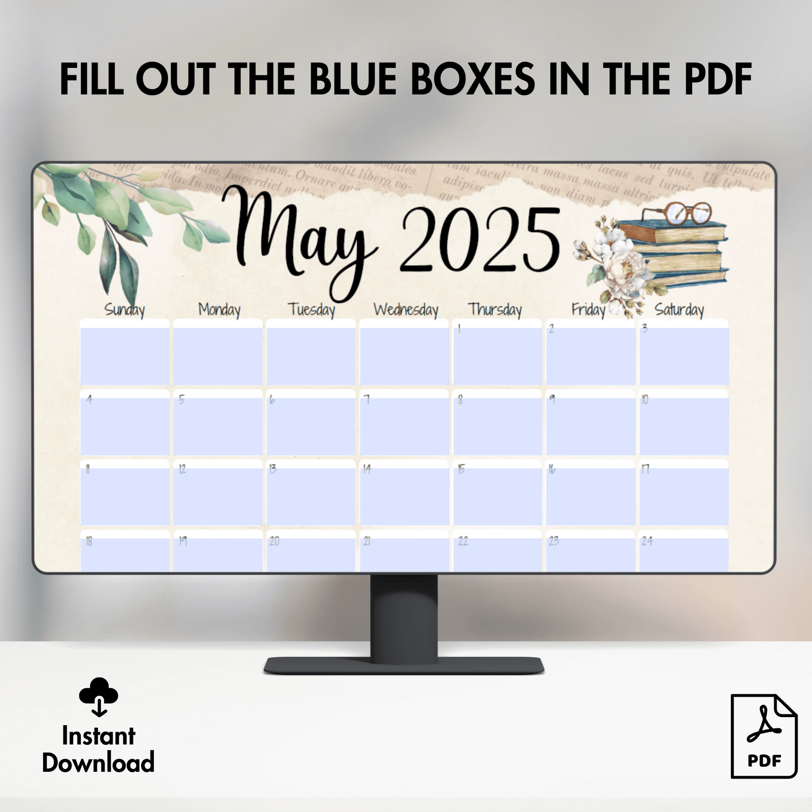 Vintage book-themed May 2025 printable calendar ? fillable PDF, Sunday & Monday start, US Letter size. Perfect for readers, writers, and cozy planning.