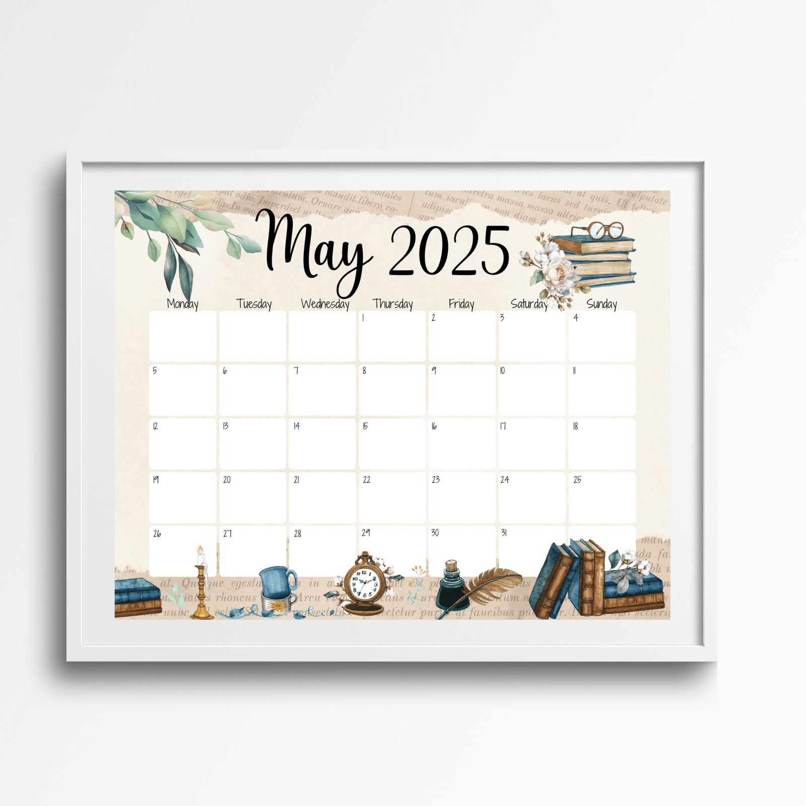 Printable May 2025 Calendar with Vintage Books & Literary Theme