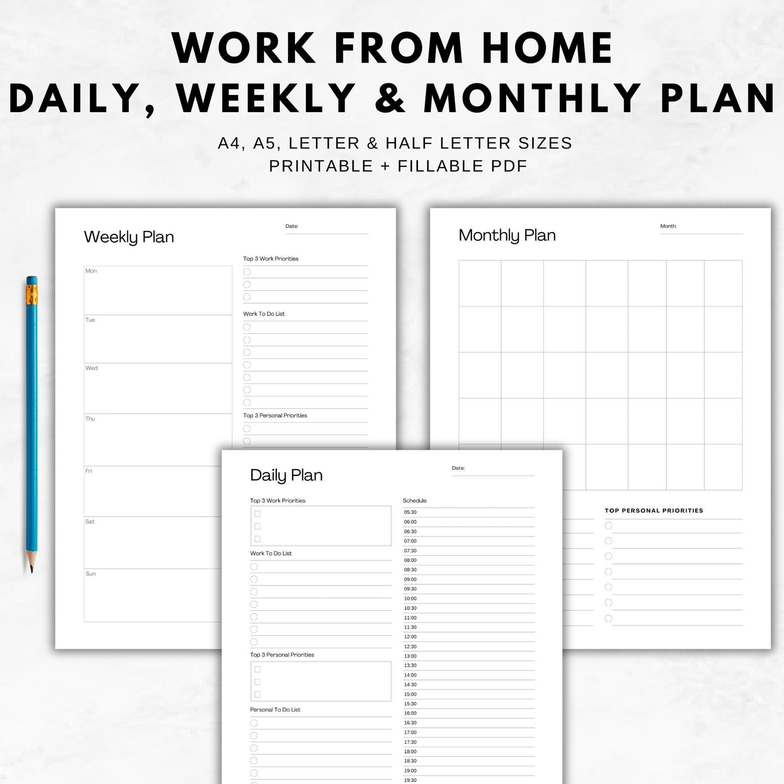 Printable Work From Home Planner, Daily Weekly Monthly Planner