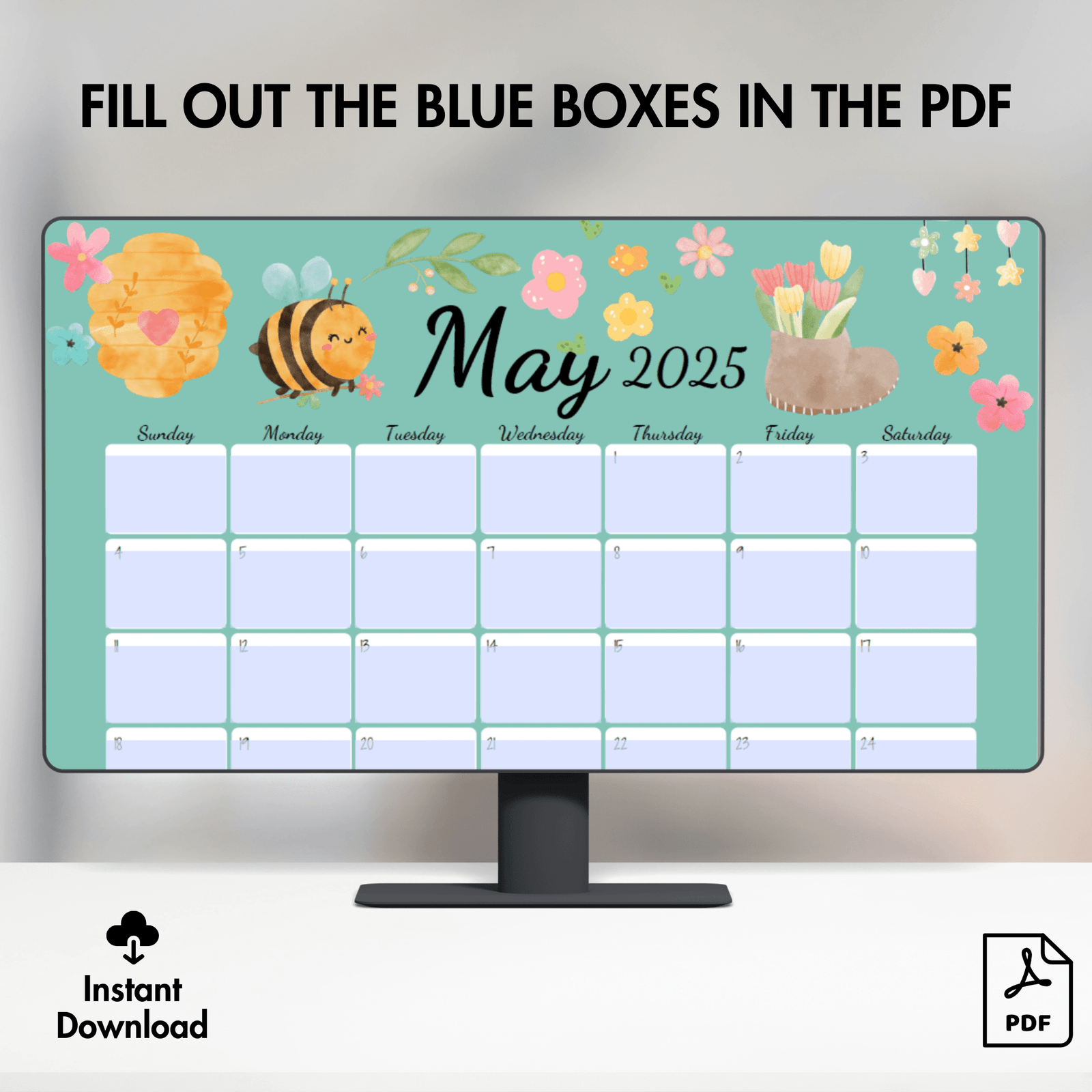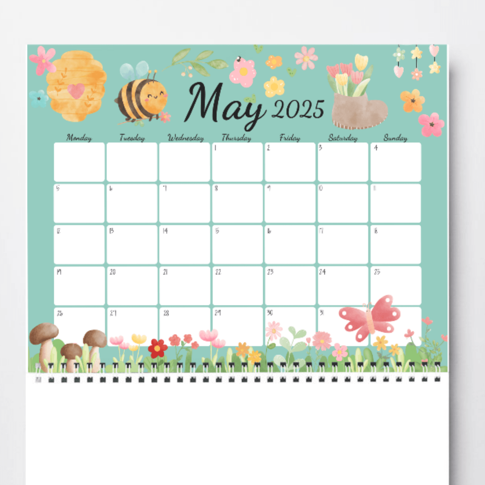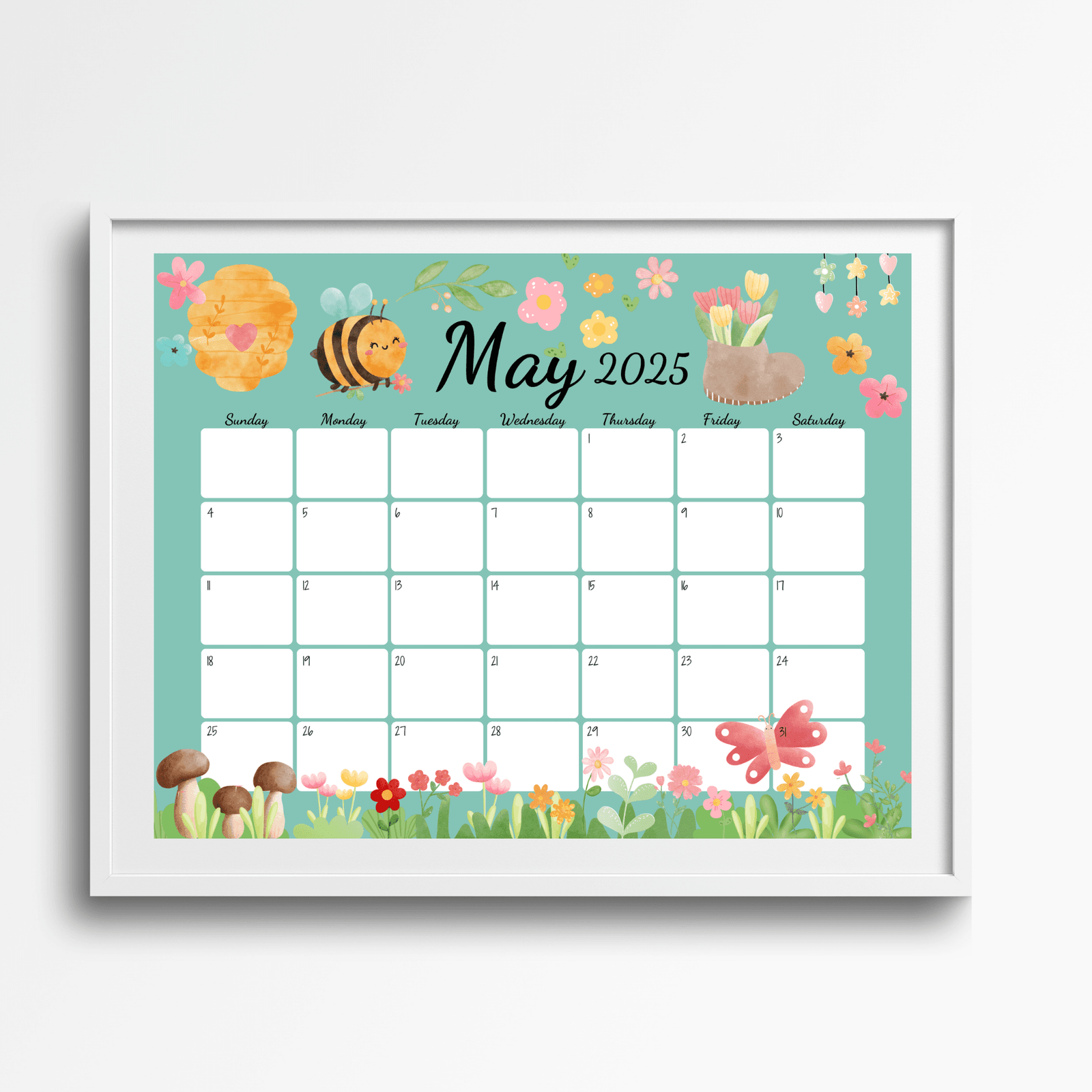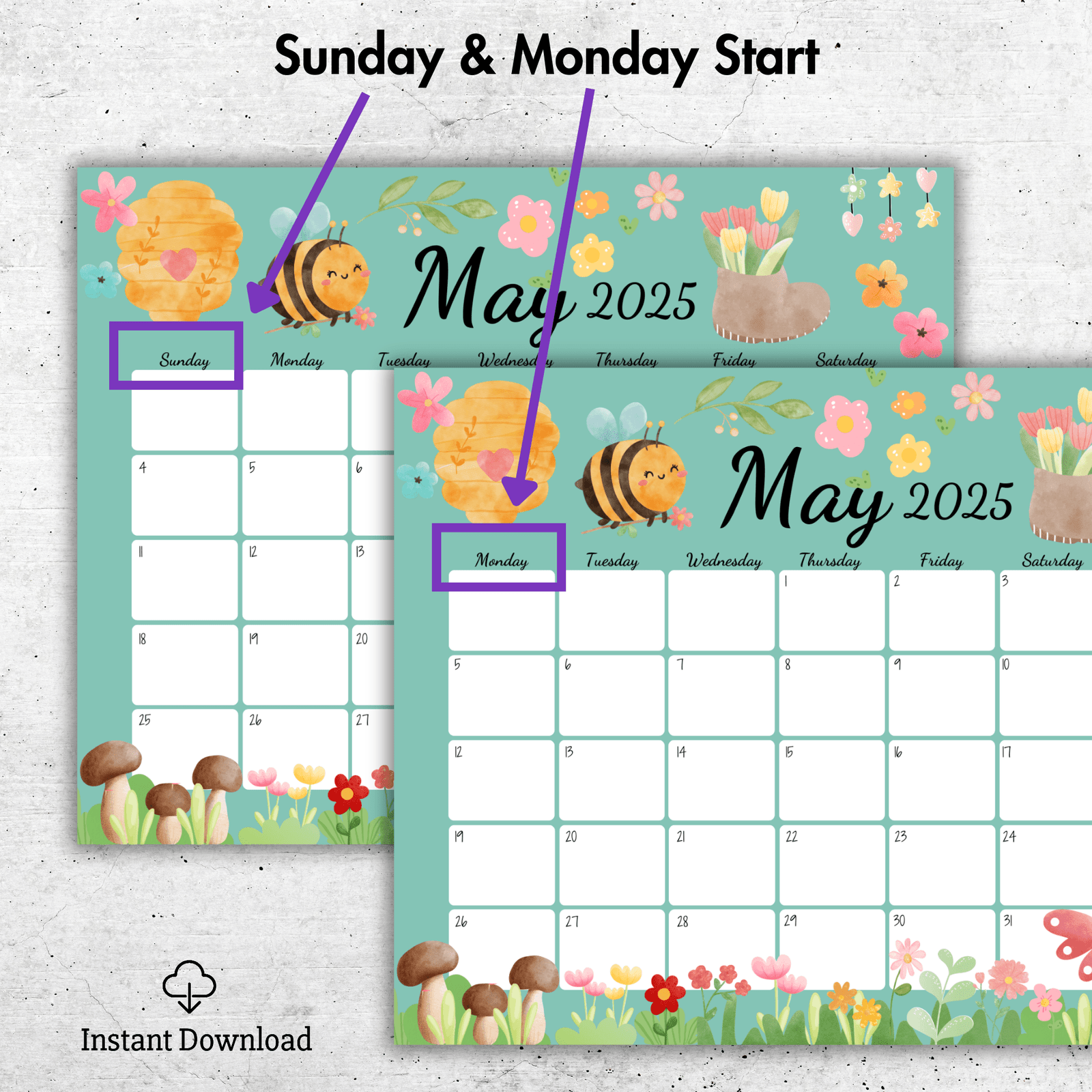 Cute Spring Flowers Theme May 2025 Calendar with bees, flowers & mushrooms. Fillable PDF, Sunday & Monday start. Perfect for kids and family planning.