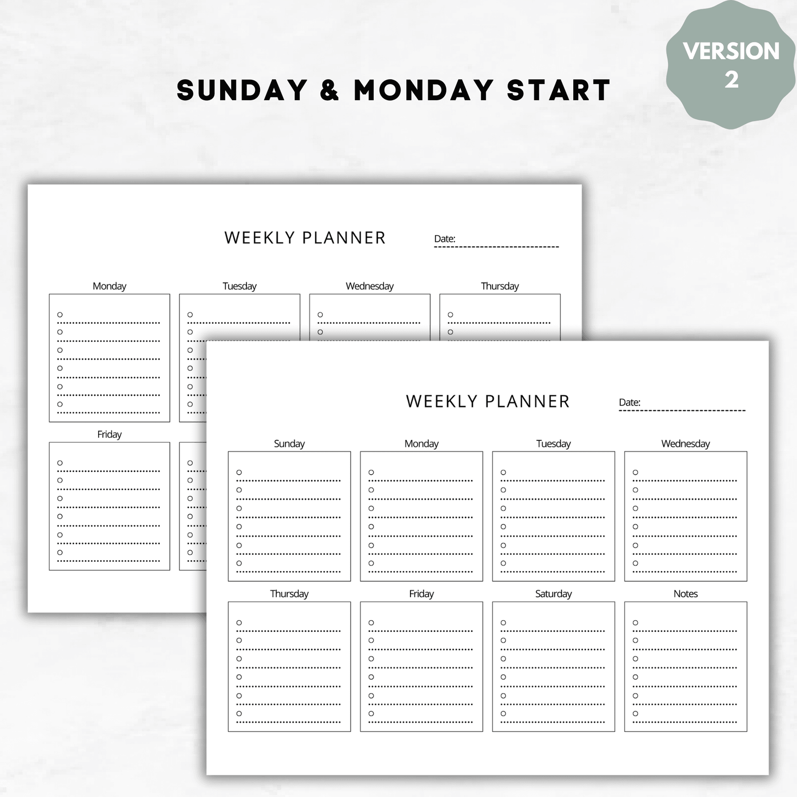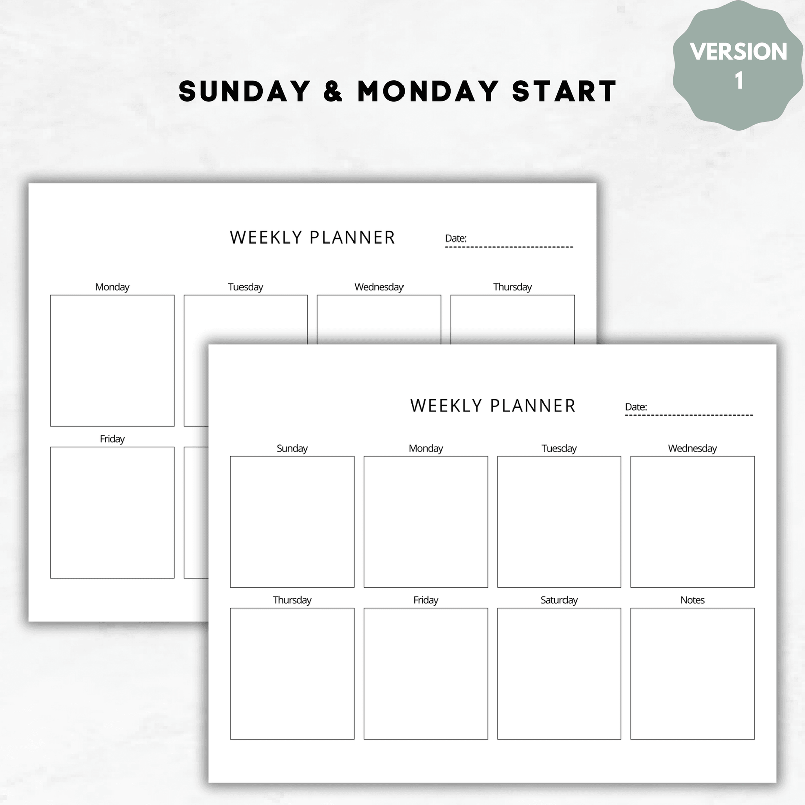 Includes Sunday and Monday Start options for flexible planning.